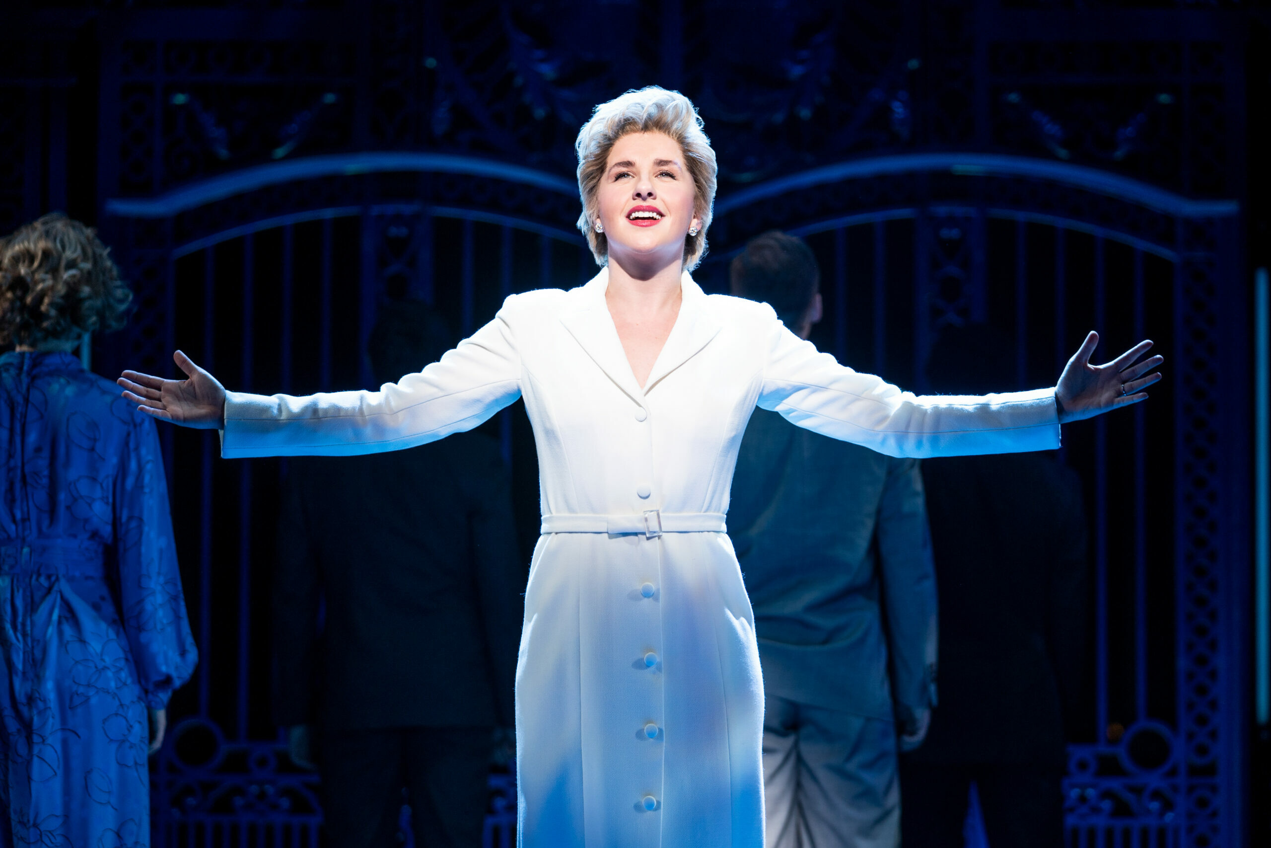 There are almost too many ill-conceived choices to count: the lyrics, by Joe DiPietro & David Bryan, are basic to the point of stupidity (“Him & Her (& Him & Her”); choreography by Kelly Devine appears amateurish and clunky. There’s a song with liberal uses of the word “fuckity” to describe her infamous revenge dress. The de facto narrator of this whole thing is Barbara Cartland, of whom many younger people probably haven’t heard, giving her multiple pop-up appearances a regular dose of WTF.