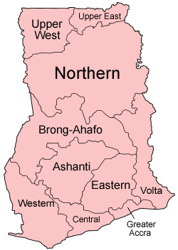 Map of the regions of Ghana, named in English (native language). The individual maps are: