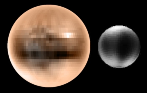 Explanation: Pluto is the only one of the nine objects classified as planets until 2006 in our Solar System remaining unphotographed by a passing spacecraft. Distant Pluto and its moon Charon therefore remain somewhat mysterious. In addition to direct imaging by the Hubble Space Telescope, careful tracking of brightness changes that occur as each object eclipses the other have allowed astronomers to build up the above black & white surface maps. These maps depict the face of Pluto (left) that always faces Charon, and the face of Charon that always faces away from Pluto. The rectangular pixels are an artifact of the mapping software. The Pluto-Kuiper Express mission was tentatively planned for launch in 2003 with an expected encounter of Pluto around the year 2012. However, this mission was cancelled for budgetary reasons. A new mission to study Pluto and the Kuiper Belt called New Horizons launched on January 11, 2006, with is expected to fly-by Pluto in July 2015.