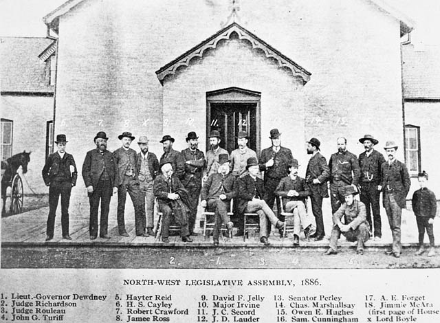Photo of Legislative Assembly of the Northwest Territories members outside of the territorial government building in Regina, Saskatchewan. Photo taken in 1886. source