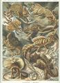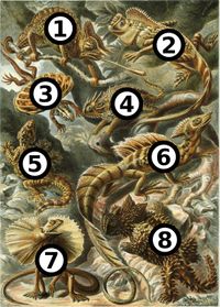 The 79th lithographic plate from Ernst Haeckel's Kunstformen der Natur (1904) depicts a variety of lizards, or Lacertilia. In terms of evolutionary relationships, these eight lizards demonstrate the diversity of the Lacertilia suborder, which has been replaced by an array of new suborders and infraorders in recent classifications. Unusual species of chameleon and gonocephalus are at the top; the second row has a flying dragon and a Texas horned lizard; the third row has a flying gecko and a common basilisk; on the bottom row are the aptly named frill-necked lizard and the Thorny Devil. As in many of Haeckel's prints, the colors and spatial composition are more of an aesthetic choice than a reproduction of nature; the lithographer Adolf Glitsch worked directly from Haeckel's sketches rather than from first-hand specimens.