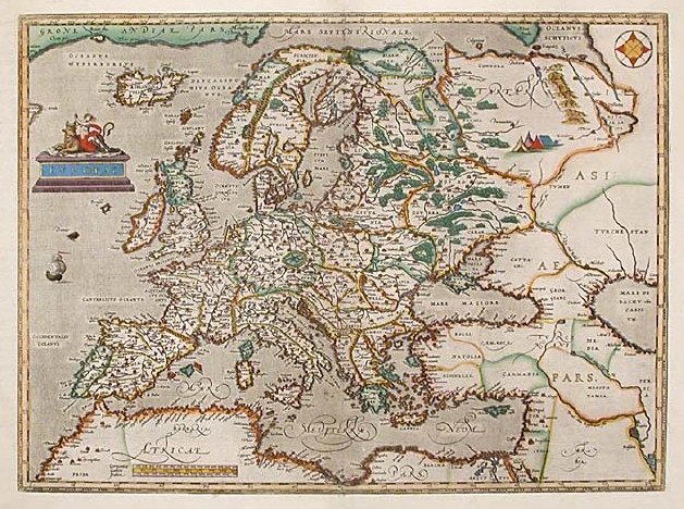 Abraham Ortelius: Map of Europe, 1595. Hand-coloured copper engraving. Source: http://www.donaldheald.com/