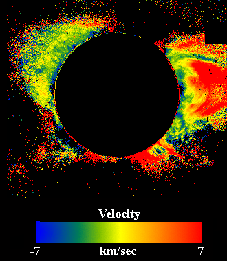 A picture of the solar corona taken with the LASCO C1 coronagraph which employed a tunable Fabry-Perot interferometer to recover scans of the solar corona at a number of wavelengths near the FeXIV green line. The picture is a colour coded image of the doppler shift of the line, which may be associated with the coronal plasma velocity towards or away from the satellite camera.