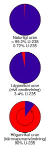 Pie-graphs showing the relative proportions of uranium-238 (blue) and uranium-235 (red) at different levels of enrichment. |