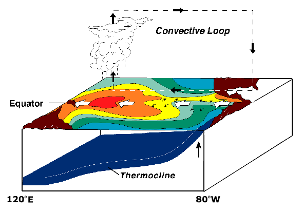 - Hot air rises in western Pacific, travels eastward and cool air descends on South America.