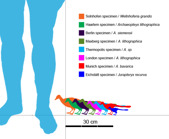 Several specimens of Archaeopteryx compared in size to a human. Based on size comparison by Jaime Headden and drawing by F. Spindler.