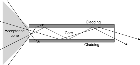 Incident rays which fall within the acceptance cone of the fibre are transmitted, whereas those which fall outside of the acceptance cone are lost in the cladding.