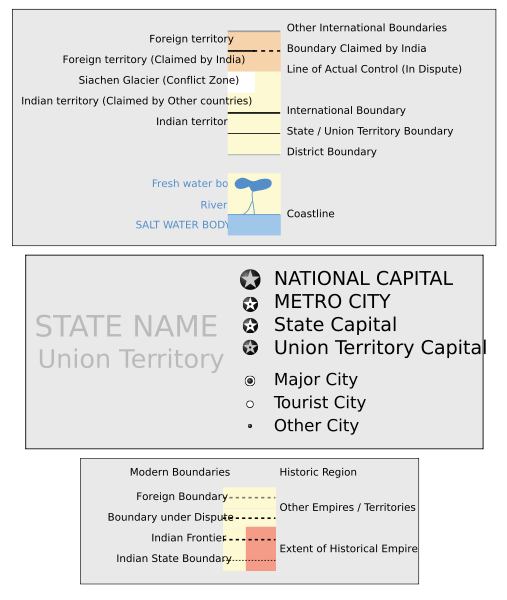 International Borders: University of Texas map library - India Political map 2001 Disputed Borders: University of Texas map library - China-India Borders- Eastern Sector 1988 & Western Sector 1988, Kashmir Region 2004 . State and District boundaries: Census of India - 2001 Census State Maps Survey of India Maps. Other sources: US Army Map Service, ESRI ArcWeb Explorer, Survey of India Map Explorer, Indian Railways Map Map specific sources: . |