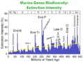 Total Phanerozoic biodiversity during the same interval. Note that this is a result of changes in both the rate of extinctions and the rate of new originations. The Dresbachian extinction event in particular is obscured by nearly immediate replacement with new genera.