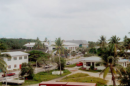 Français : Vue d'une partie du district d'Aiwo et du Civic centre (bâtiment du fond, au centre), Nauru