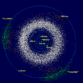 This image is based on data found in the en:JPL DE-405 ephemeris, and the en:Minor Planet Centre database of asteroids (etc) published 2006 Jul 6. The image is looking down on the en:ecliptic plane as would have been seen on 2006 August 14. It was rendered by custom software written for Wikipedia. The same image without labels is also available. |