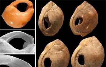 From article entitled "Shell Beads from South African Cave Show Modern Human Behaviour 75,000 Years Ago". Original caption: "The perforations of these Nassarius shells show wear marks, indicating they were used as beads." |