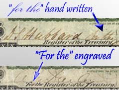 The top is of the earlier issued Demand Notes where "for the" was hand written to indicate that the person was signing in place of a treasury official.