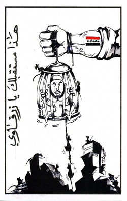 U.S. PSYOP leaflet disseminated in Iraq. It shows a caricature of Al-Qa`eda terrorist en:al-Zarqawi caught in a rat trap. The caption reads "This is your future, Zarqawi" (هذا مستقبلك يا زرقاوي). Taken from http://www.psywar.org/ with permission. His future was worse he is dead now. |