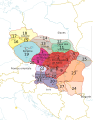 Legend: yellow lines: current borders blue lines: rivers red dots: main castles/settlements 1: from 833 to 907: Principality of Moravia 2: from 833 to 907: Principality of Nitra 3: along with 2 or along with 4 4: from 833 or from the reign of Rastislav to (?)896: Principality of Nitra 5: along with 1 or from 853/54 to (?)907: Princiaplity of Moravia 6: from 858 to (?)894: Principality of Nitra 7: along with 2 or along with 22 8: along with 6 or along with 20 9: from the reign of Rastislav (846-870) or of Svätopluk I (871-894) to 896: Principality of Nitra 10: along with 8 or along with 20 11: from 874 to (?) 907: Wislania 12: probably along with 11 13: from 880 to ?: Silesia (Silesia was not annexed according to some authors) 14: probably along with 14 15: from 890 to 897: Lusatia 16: with a high probability along with 15 17: with a high probability along with 15 18: probably along with 15-17 19: from 888/890 to 894: Bohemia 20: from 883/884 to 894: Pannonian Principality (Balaton Principality) 21: with a high probability along with 20 22: along with 20 (and 21): maybe part of the Pannonian Principality (Balaton Principality) 23: from 881/882 to 896: "Transtheissia" 24: probably along with 23 25: from the reign of Svätopluk (871-894) to (?) 896 26: from the reign of Svätopluk (871-894) to ? 27: along with 23 or along with 24