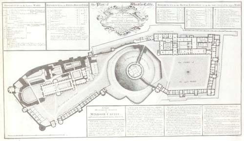 This plan of Windsor Castle in England was made by Batty Langley in 1743. George IV made substantial alterations to Windsor in the early 19th century, but all the principal elements of the present castle can be seen here. There are two baileys either side of a circular motte, which is topped by the Round Tower. St George's Chapel is in the bailey on the left. The state apartments are top right and the private apartments are bottom right.