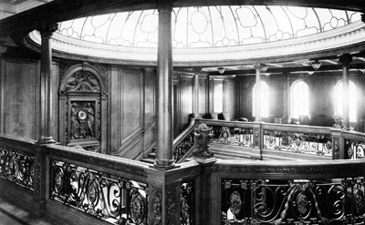 A view of the Grand Staircase with the crystal dome and the clock. Photograph taken at the boat deck level. |