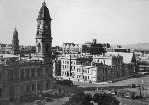 The General Post Office and Clock Tower - Adelaide, 1950. The Town Hall is the lesser spire on the left of the photo. Running through Victoria square are F type drop centre trams of the Municipal Tramways Trust.