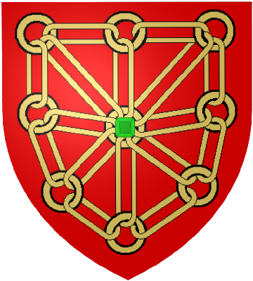 | de gueules aux chaînes d'or posées en orle, en croix et en sautoir, chargées en coeur d'une émeraude au naturel. |