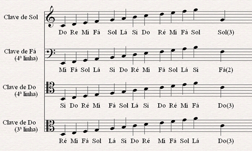 Claves musicais mais comuns com exemplos de notas. Most common clefs with notes examples This image was created by cralize for the Wikipedia