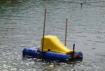 English: A so-called "Turbo aerator" used on a shrimp farm in Indonesia. Two horsepowers. Visible is only the air intake; the aerator paddles one meter below the water surface. To avoid stirring up sediments from the pool bottom, the water depth should be at least 1.5 m.