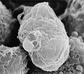 English: Scanning electron micrograph of HIV-1 budding from cultured lymphocyte. This image has been colored to highlight important features; see PHIL 1197 for original black and white view of this image. Multiple round bumps on cell surface represent sites of assembly and budding of virions.