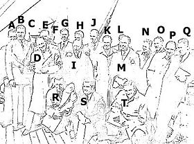 Identification of the individuals was discussed here. Note that separate, but non-free photo of the same group and taken from a slightly different angle exists, which helps further identification. |