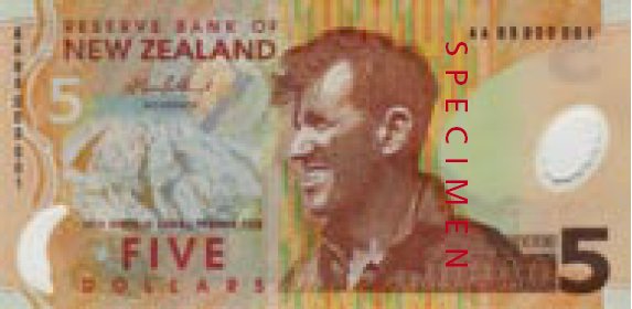 New Zealand $5 specimen banknote produced by the NZ government. Source: