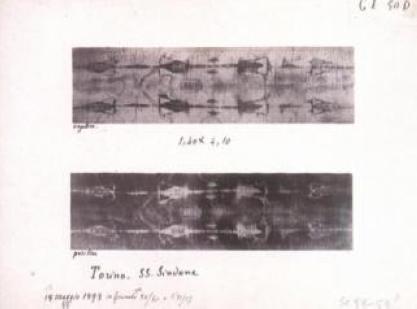 English: This photo shows a positive and negative image of the Shroud of Turin. Photo taken in 1898 by Secondo Pia (1855-1941). This is the first photo taken of the relic in history.