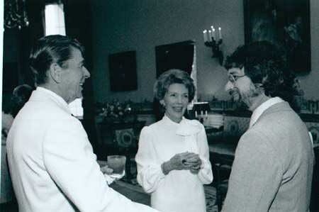 Ronald Wilson Reagan (left), Nancy Davis Reagan (centre), and Steven Allan Spielberg (right)
