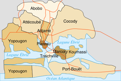 Abobo, Adjamé, Attécoubé, Cocody, Plateau and Yopougon are located North of the Ébrié Lagoon (called Abidjan North) on the continental side of Abidjan.