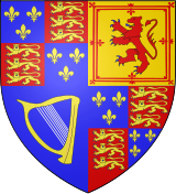 Whilst he was King, Charles I's arms were: Quarterly, I and IV Grandquarterly, Azure three fleurs-de-lis Or (for France) and Gules three lions passant guardant in pale Or (for England); II Or a lion rampant within a tressure flory-counter-flory Gules (for Scotland); III Azure a harp Or stringed Argent (for Ireland).
