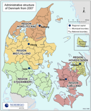Denmark is divided into five regions ( Danish: regioner, singular: region) and a total of 98 municipalities. The regions were created on 1 January 2007 as part of the 2007 Danish Municipal Reform to replace the country's traditional thirteen counties ( amter). At the same time, smaller municipalities ( kommuner) were merged into larger units, cutting the number of municipalities from 270 to 98. The most important area of responsibility for the new regions is the national health service. Unlike the former counties, the regions are not allowed to levy taxes, and the health service is primarily financed by a national 8% (sundhedsbidrag) tax combined with funds from both government and municipalities. Each Regional Council consists of 41 elected politicians elected as part of the 2005 Danish municipal elections.