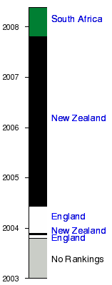 England have won 316 of their 594 Test matches, a winning record of 53.20%. When the World Rankings were introduced in October 2003, England were ranked first. They briefly fell to second in September that year before regaining first place. They fell to second, and then to third in June 2004. After the 2005 Six Nations they fell to sixth where they remained until they moved into fifth in December that year. In 2006, their ranking again fell and they finished the year ranked seventh. They are ranked fourth, behind South Africa, New Zealand and Argentina, as of 5 November 2007.