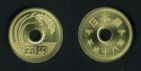 After the war, brass 50 sen, 1 and 5 yen were introduced between 1946 and 1948. In 1949, the current type of holed 5 yen was introduced, followed by bronze 10 yen (of the type still in circulation) in 1951.