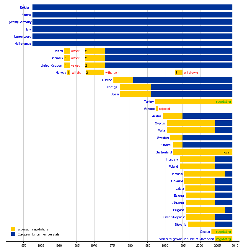 This is a list of European Union member states, their dates of application and accession. It shows the growth of the European Union and its predecessors through enlargement from six members in 1952 to twenty-seven members in 2007; at least eight (possibly even more) are expected to join in its future.