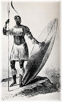 ![]() Only known drawing of Shaka standing with the long throwing assegai and the heavy shield in 1824 - four years before his death